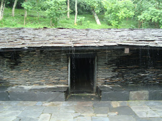 The stone-slate houses are built into the slopes of the mountains. This helps protect the occupants during land slides and typhoons. A whole family will live inside one house where much of the inside is devoted to storing millet and grains. There is a large fire well dug in the centre of the house for cooking.